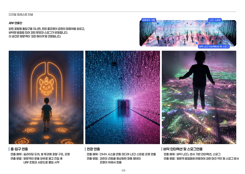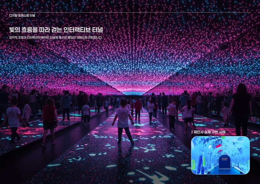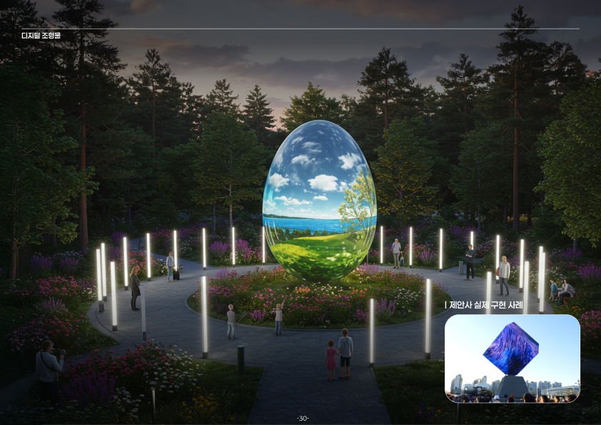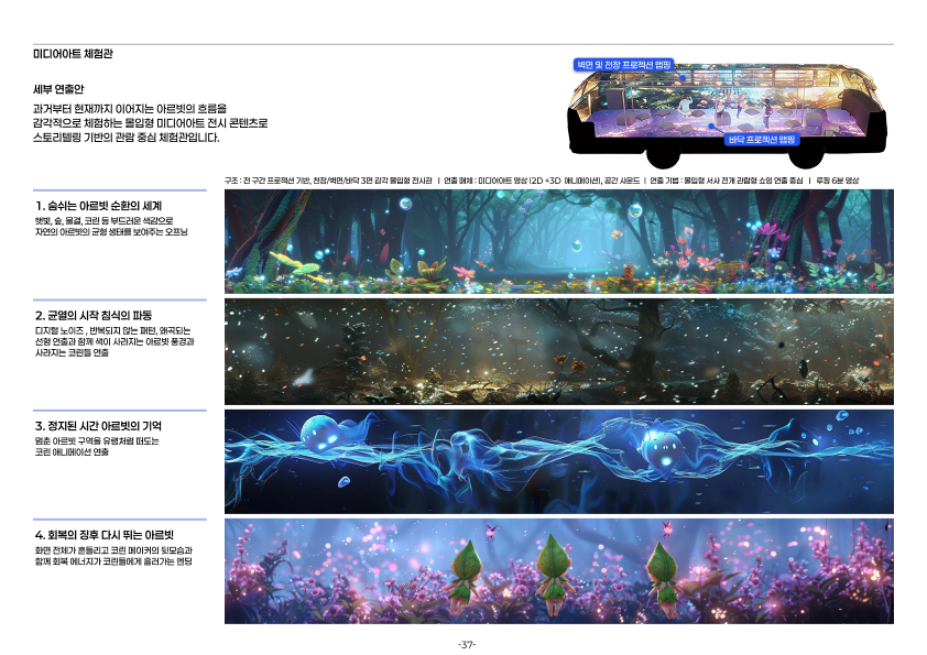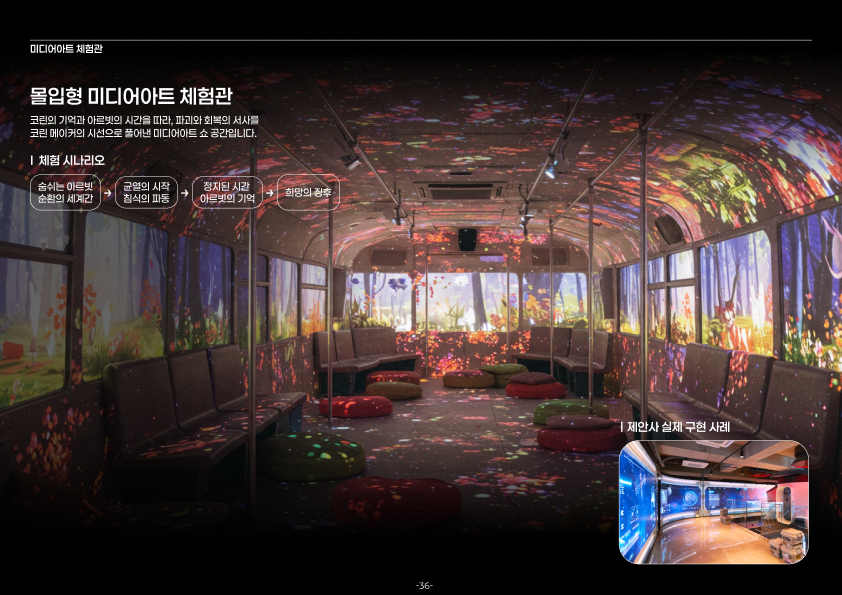 공공 수목원 및 공원을 배경으로 제안된 디지털 포레스트 조성 사업 제안은 디지털 공간 기획 및 구축, 체험형 어플리케이션 설계, 관객 경험 설계로 이루어져 제안된 프로젝트 입니다. 자연의 리듬과 지형적 구조에 따라 유기적으로 배치된 디지털 인터랙션을 통해 식물·물·빛이 감각적으로 연결되는 몰입형 공간 경험을 구상했습니다. ‘쉼’과 ‘깨어남’을 주제로, 도심 속 자연의 존재감을 재조명하는 실험적 시도였습니다.